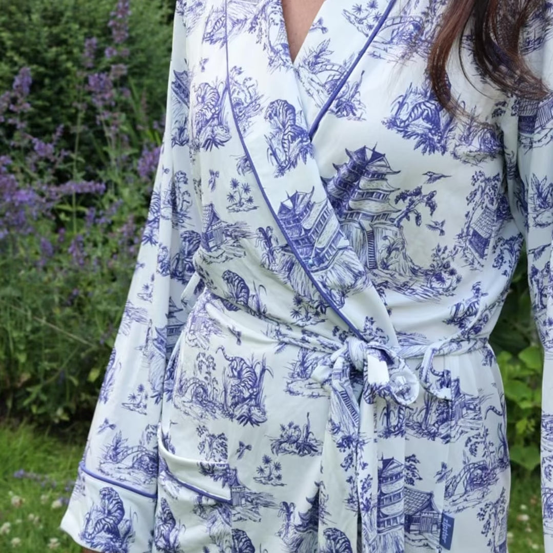 Indulge in the finest of fabrics with our Toile de Jouy bamboo robe.